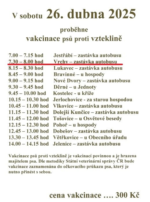 Vakcinace proti vzteklině 25.4.2025 Sdílet Sdílet Klikněte pro zkopírování URL Facebook V sobotu 26. dubna 2025 od 7:30 - 8:00 hod., cena 300 Kč.